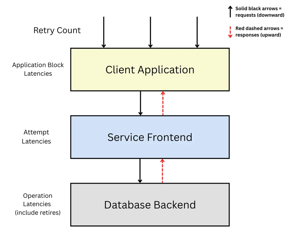 The diagram below shows where retries, application-blocking delays, attempt latencies, and operation latencies are measured across the client–service–database lifecycle.